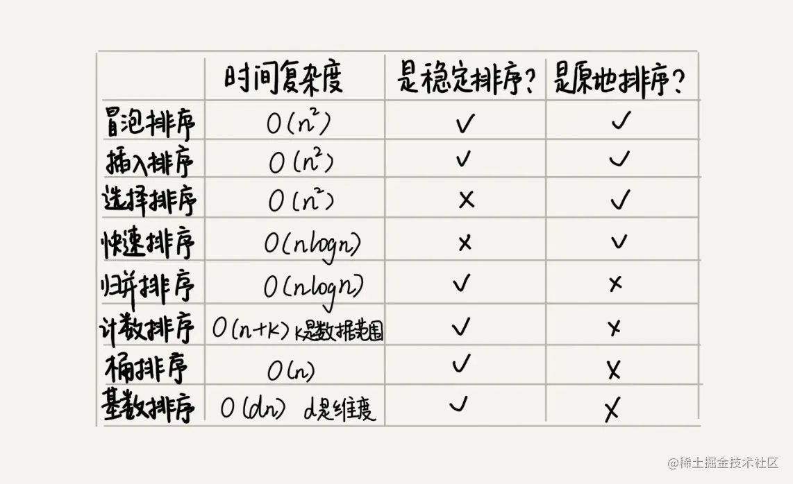 - 线性排序算法包括桶排序、计数排序、基数排序。
