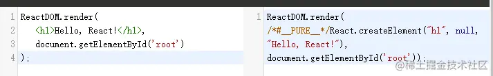 3.移除React.createElement('h1', null, 'Hello, React!'),替换为JSX语法:<h1>Hello, React!</h1>