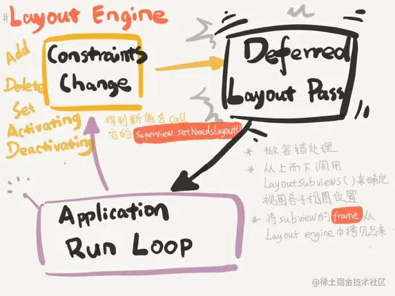 每个视图在得到自己的布局前,Layout Engine会将试图、约束、优先级、固定大小通过计算转换成最终的大小和位置。每当约束发生变化,就会触发Deffered Layout Pass,完成后进入监听约束变化的状态。当再次监听到约束变化,就会进入到下一轮的循环中。过程如下图。