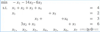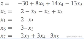 同样的,将非基本变量设为0,于是得到解:(2, 0, 0, 2, 0, 3, 6)T,目标函数的值减少为-2。