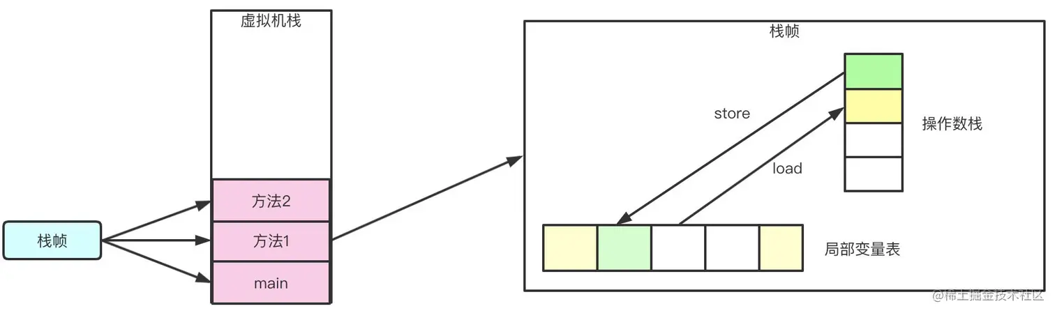 我们明白一点,方法的调用过程就是栈帧入栈和出栈的过程,栈帧随着方法的调用创建,方法结束销毁。栈帧的内部包含局部变量表、操作数栈、动态链接等。