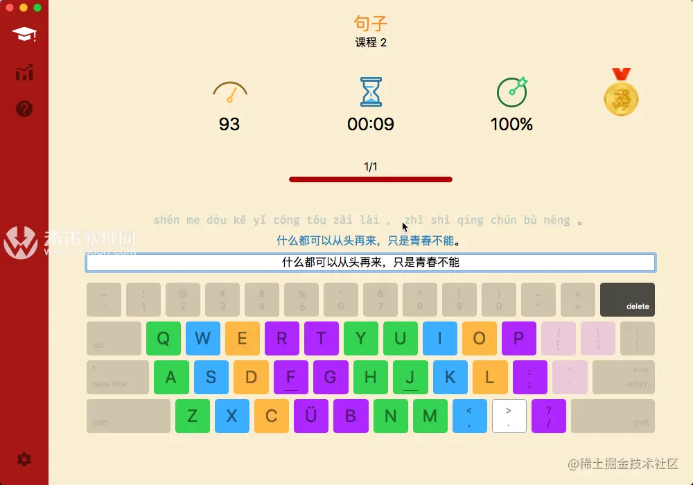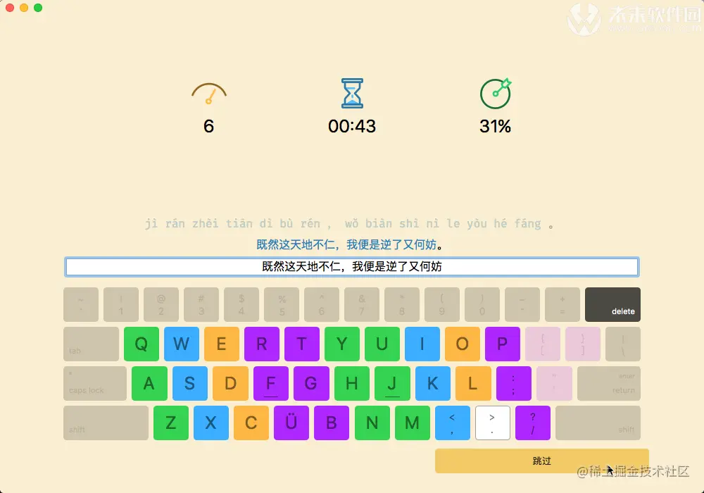 Master of Typing in Chinese Mac中文打字大师 i不爱吃鱼的猫 2020-09-22 704 阅读2分钟 Master of Typing for Mac是一款专业练习打字的中文打字大师,Master of Typing in Chinese Mac可以帮助需要经常使用电脑而打字速度不够的人学习快速打字、盲打等技巧,非常的方便。现在我们日常生活中越来越离不开电脑了,学会快速打字是非常重要的! 很多现代人几乎生活在电脑。这就是为什么快速打字很重要。Master of Typing in Chinese for Mac是为那些想学习打字的人而准备的。Master of Typing for Mac整体的设计风格很不错,有练习模式和考试模式,需要打字练习软件的人可以试试这个软件。 提高你的打字速度 - 各种练习:字母和特殊字符,单词和短语。 1.点击设置(左下角)。 2.请确保自动困难关闭。 3.选择一个难度级别,然后选择一课。 4.使用左/右箭头键选择课程部分。 - 自动难度设置: 1.单击设置(左下角)。 2.如果练习成功,选择自动难度自动移动到下一课。 3.如果您只想练习本课的信件,请取消选择自动难度并选择课程。 检查新技能 - 多个级别的考试。 - 准确的统计结果: 最佳和平均速度, 最佳和平均准确度。 享受优点: - 智能计时器 - 当您在应用程序窗口外单击时停止。 所以,你可以回来练习,随时继续练习。 - 3个主题:光明,黑暗和东方 - 选择适合您需求的最普遍方便的主题。 - 轻扫和快捷键可快速切换窗口。 - 彩色键盘的方案来记住手指的位置。 - 适合随时自学。 来自 “未来软件园” ,链接:http://r6f.cn/h8Jt,如需转载,请注明出处,否则将追究法律责任。