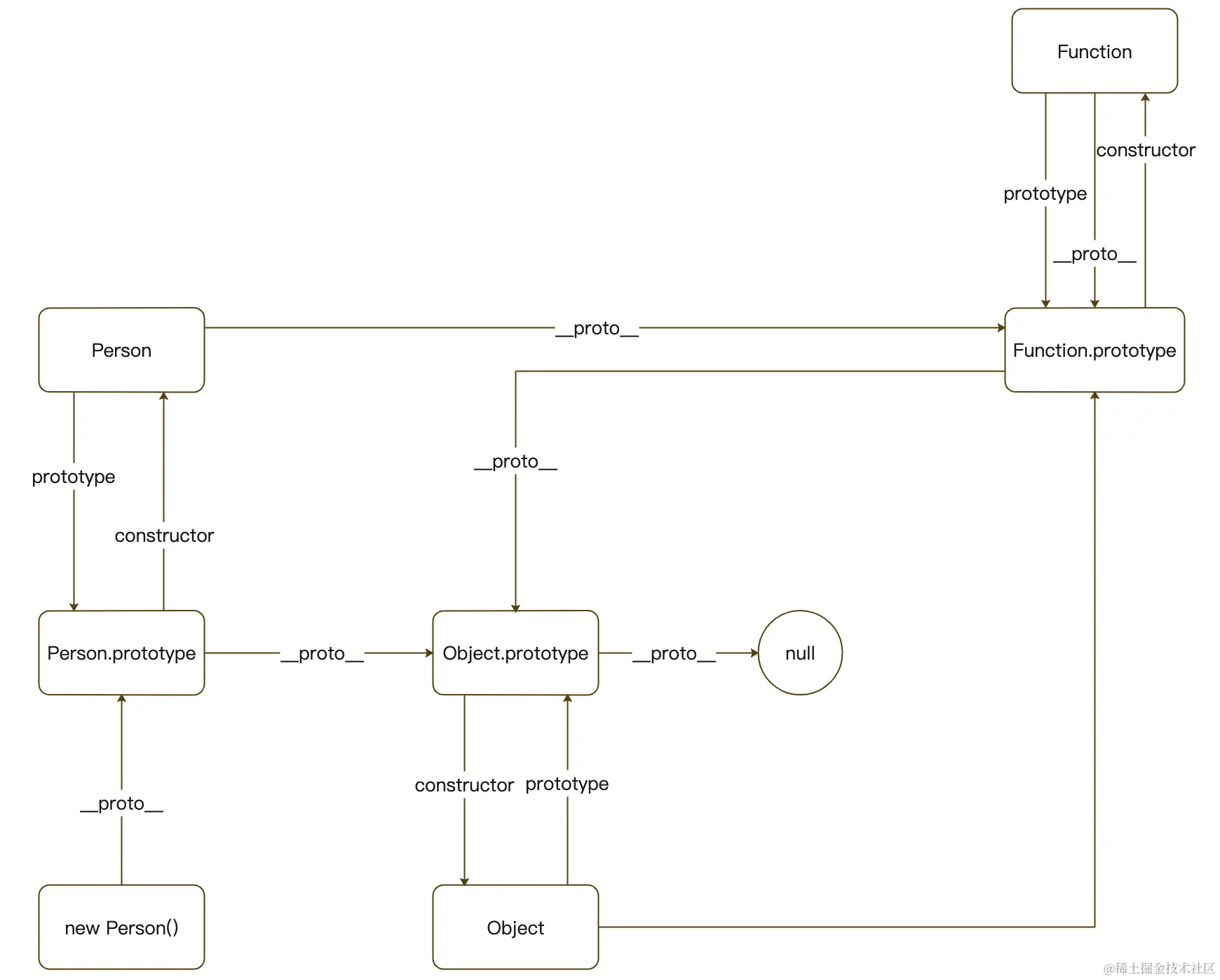 每个实例对象( object )都有一个私有属性(称之为 __proto__ )指向它的构造函数的原型对象( prototype )。该原型对象也有一个自己的原型对象( __proto__ ) ,层层向上直到一个对象的原型对象为 null。根据定义,null 没有原型,并作为这个原型链中的最后一个环节。