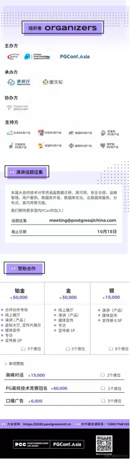 作为全球最大、最知名的PG序列会议,从纽约到莫斯科,从里约热内卢到约翰内斯堡,全球各地区都有PGConf在运行。而亚洲规格最高的PG技术盛会—PGConf.Asia大会,将于今年11月首度在中国举行。中国开源软件联盟PG分会作为东道主承办本次会议,采用”线上线下结合“的形式,通过墨天轮社区面向全球直播。本次大会将集中国PG力量和亚洲主要PG贡献者、应用企业共同打造亚洲范围内最大规模的PG生态会议。