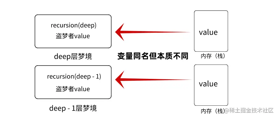 5 recursion(deep + 1);// 递归了上一层梦境,而不是第一层