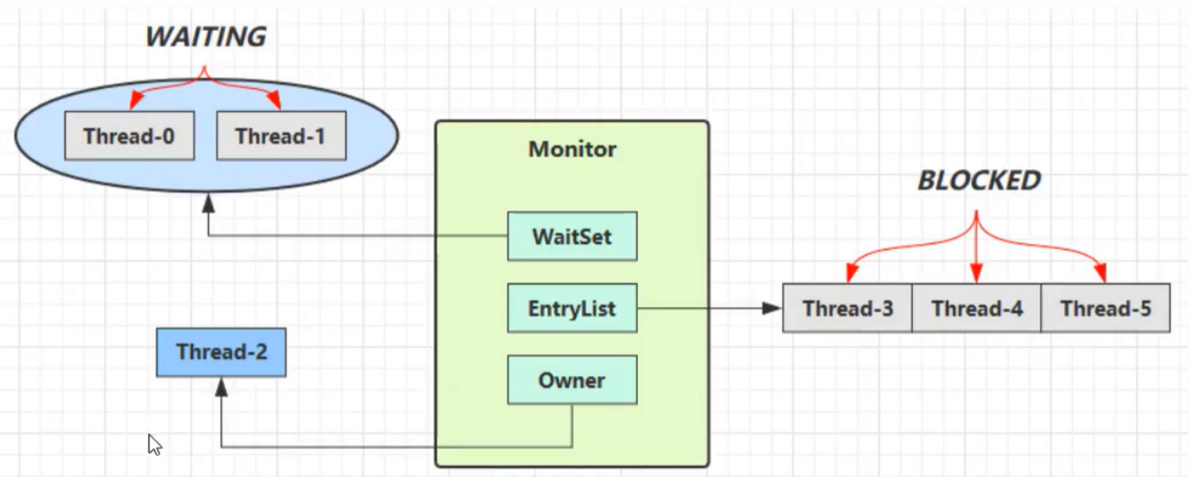 - Thread-0先获取到对象的锁,关联到monitor的owner,同步代码块内调用了锁对象的wait()方法,调用后会进入waitSet等待,Thread-1同样如此,此时Thread-0的状态为Waitting