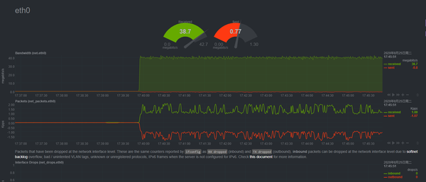 实际效果参考:下图是通过netdata监控云主机eth0网卡的流量,可是直观的看到收方向和发方向的流量状况,相比sar工具统计更为直观。