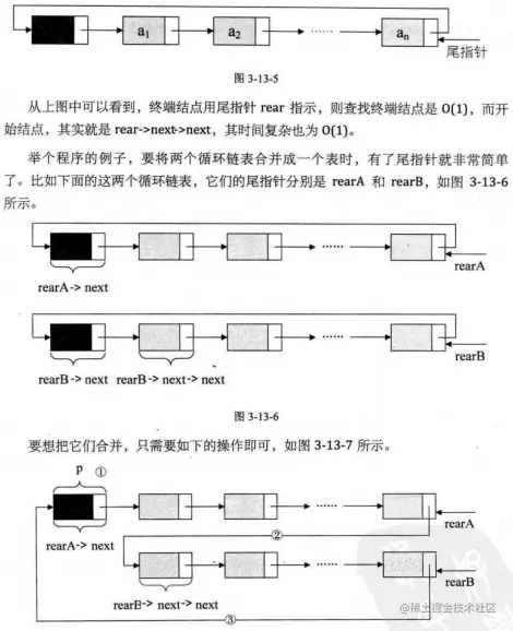 尾指针:为了更方便的找到最后一个结点,我们将最后一个结点的尾指针来表示循环链表,如下图所示