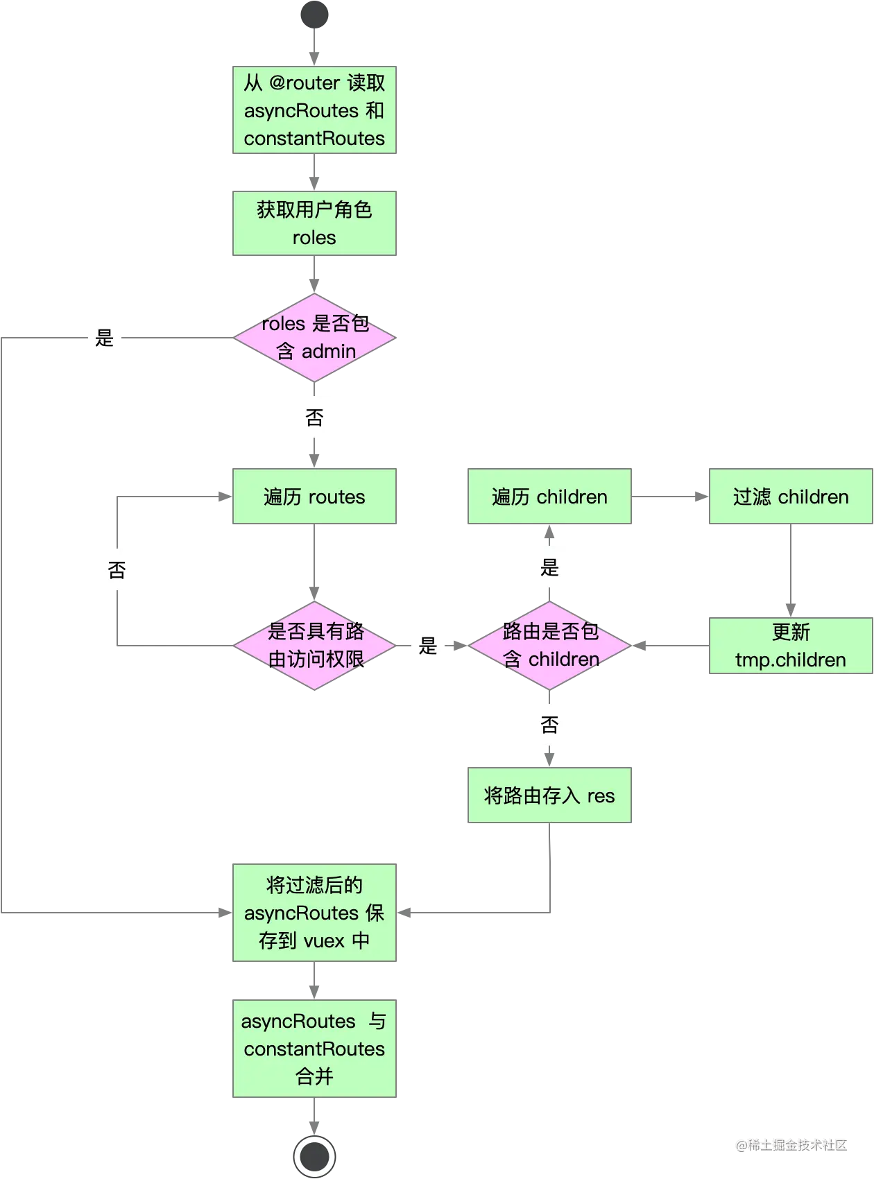 router.js定义的两种路由。判断当前身份是否是管理员,是则直接拼接,否则需要过滤出具备权限的路由,最后拼接到常规路由后面,通过addRoutes追加。