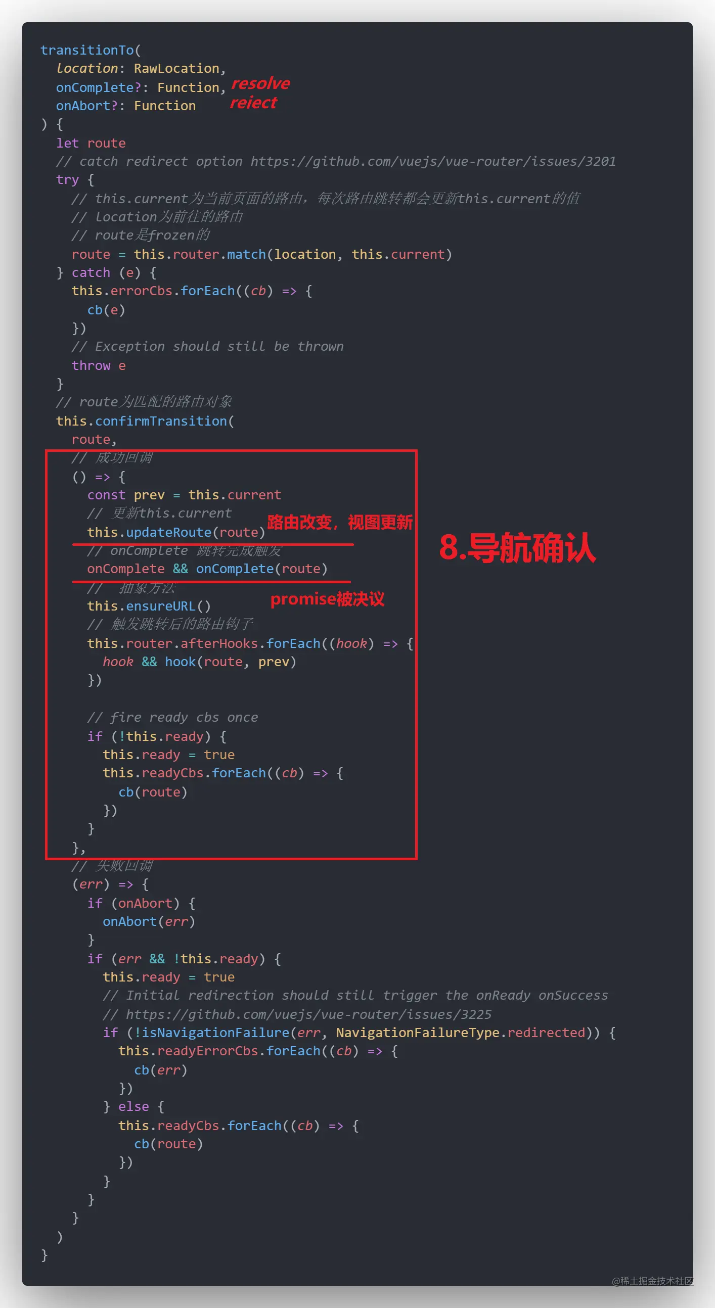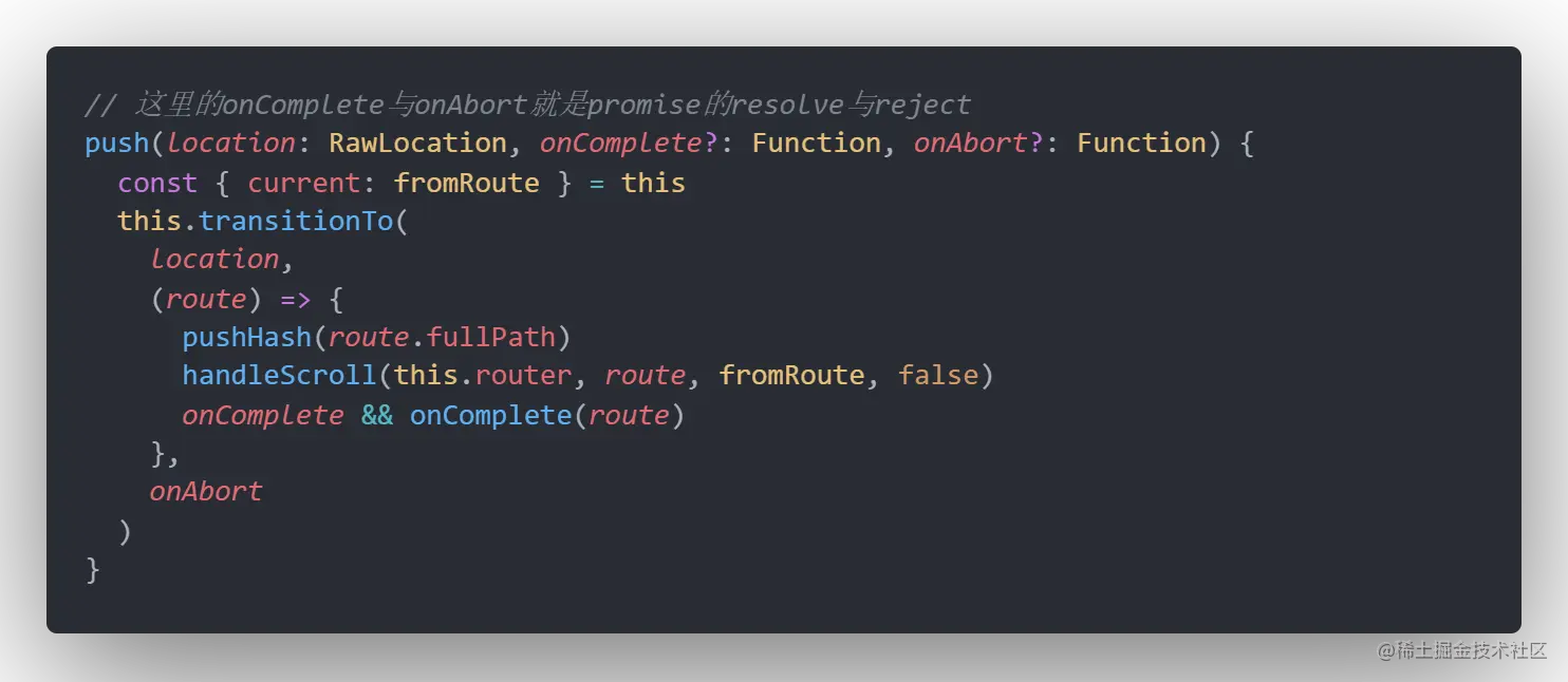 那么就涉及到resolve与reject是何时被调用的问题了,接着查看代码(hash模式为例)发现,就是传入了transitionTo的方法。
