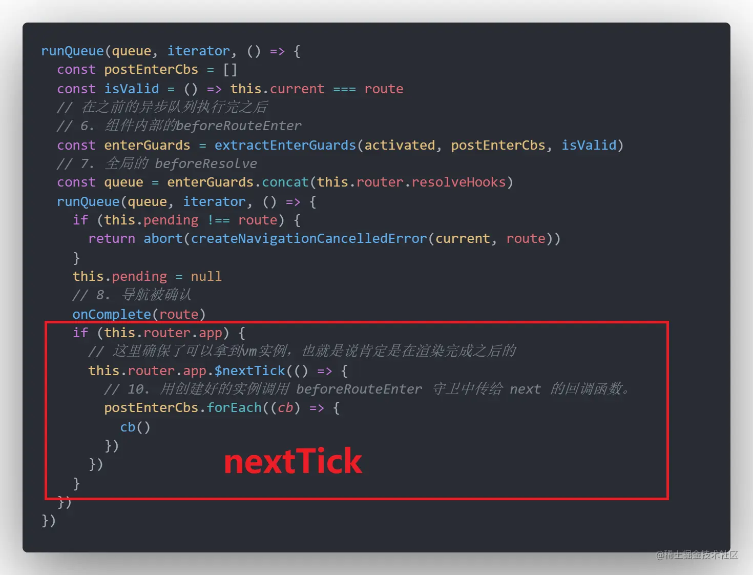 因此这轮的tick中只有触发导航守卫,而不会触发视图更新。另外,在组件内的守卫beforeRouteEnter中我们可以取到其组件实例。也是因为使用了nextTick函数,以保证守卫获取到的实例是更新后的实例。