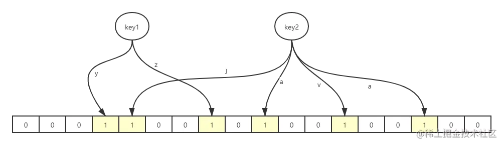 向布隆过滤器询问这个key是否存在时,也一样先计算出一个hash值,再看看这几个位置是否都为1,只要有一个为0,就说明这个key不存在。但是如果都是1,却不一定说明这个key一定存在,因为这些位被置为1可能是因为其他的key所导致的。