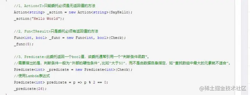 委托是方法的抽象,它存储的就是一系列具有相同签名和返回回类型的方法的地址。调用委托的时候,委托包含的所有方法将被执行。