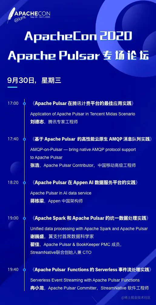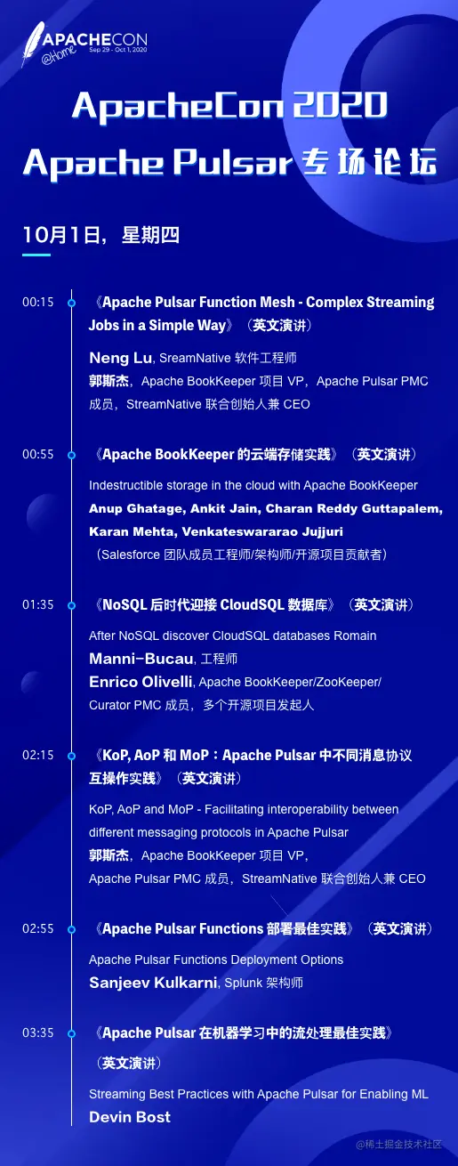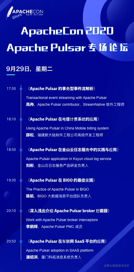 2020 年 ApacheCon 大会全程线上举办,从 9 月 29 日到 10 月 1 日,会议共持续 3 天。Apache Pulsar 作为 Apache 软件基金会顶级项目,在本次大会开设了 Apache Pulsar 专场论坛。