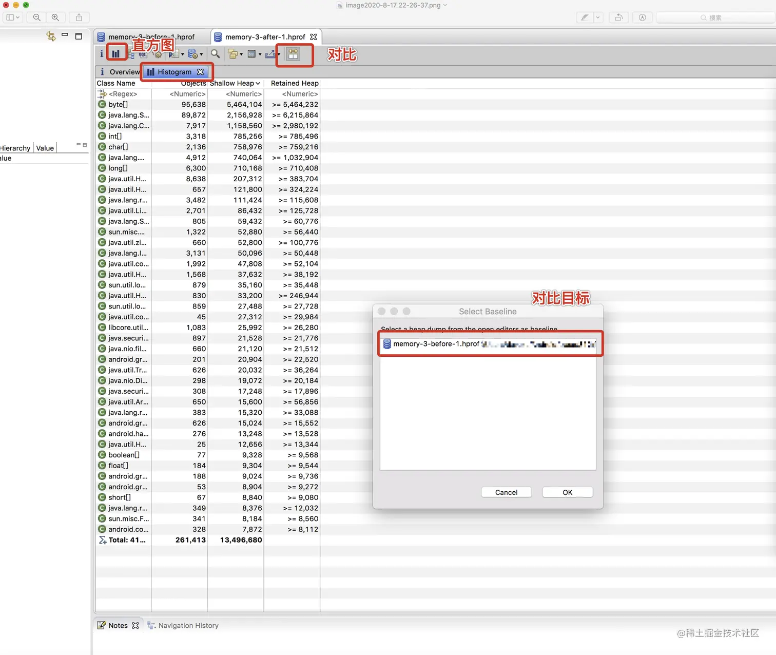 - 有时候我们往往总是需要进行前后对比,如果人工对比比较麻烦还不够精准。这时我们可以使用MAT工具,该工具依赖Profiler生成的的hprof文件。