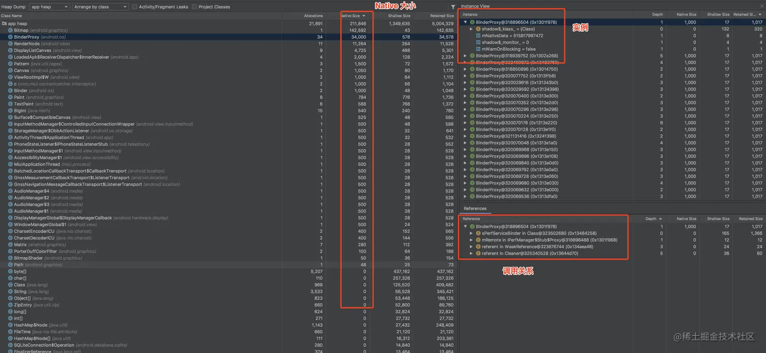 | Native Heap | Native(C)代码分配的内存,虚拟机和Android框架本身也会分配。 |
