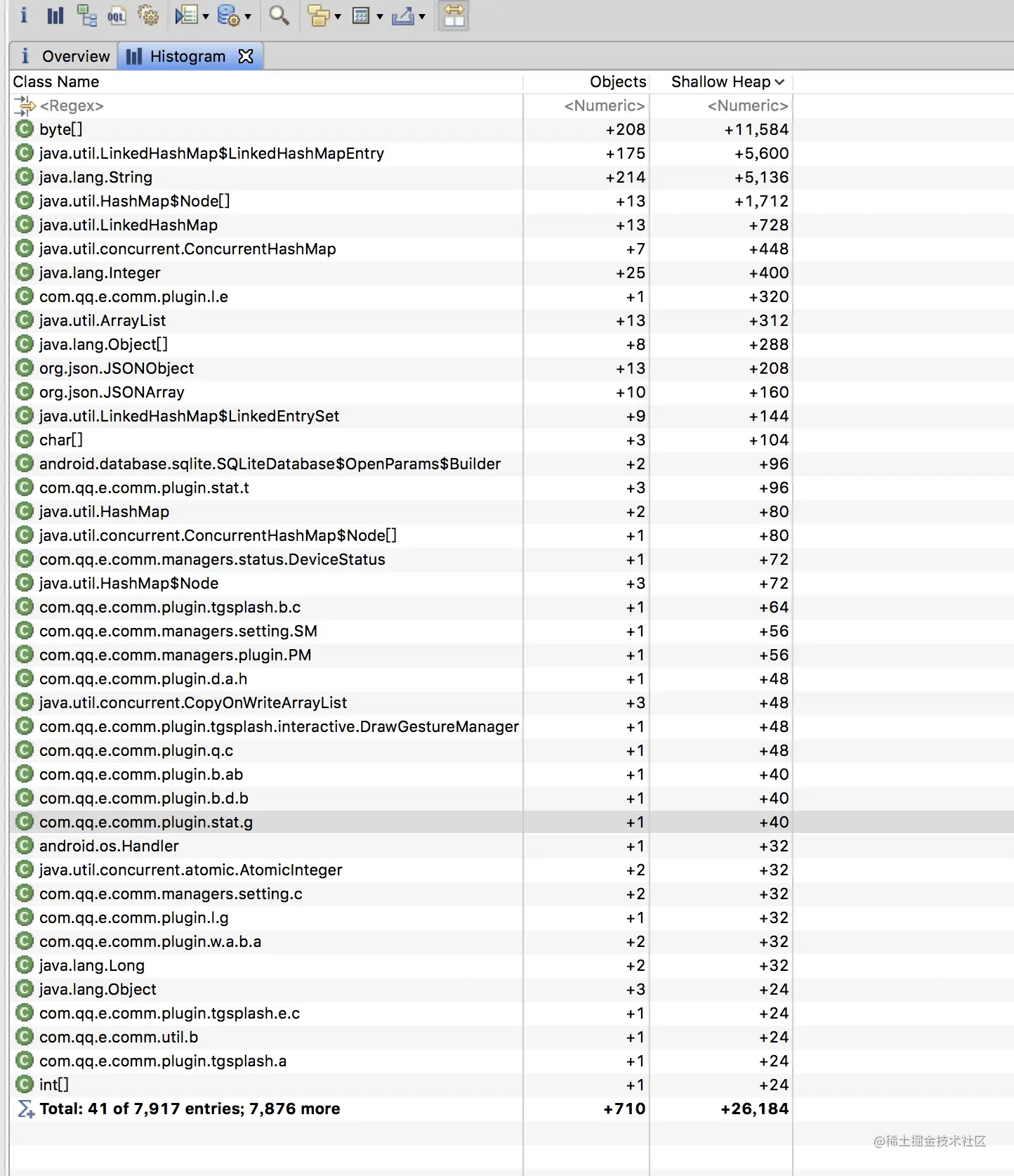 选择直方图,进行对比,这里可以清晰的看到对象的增量,从而进一步分析哪里存在问题。