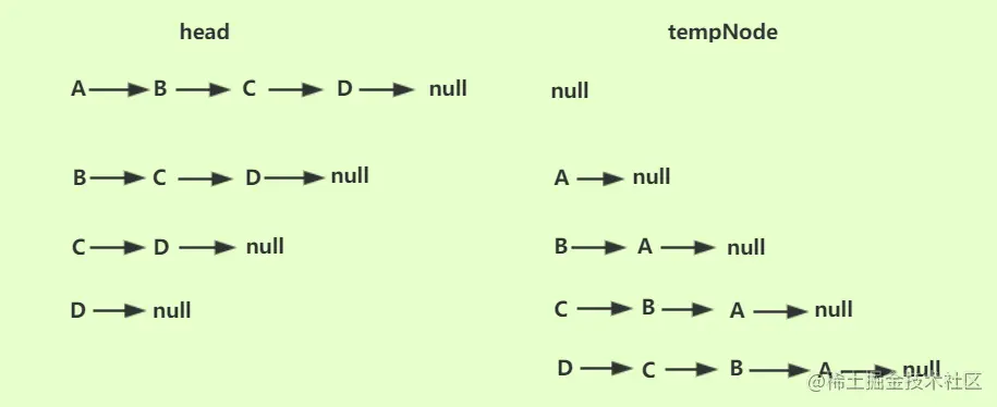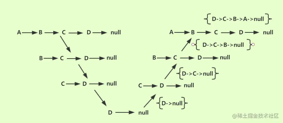 依次反转时,A 结点的 next 指针指向 null, 然后 B 结点的 next 的指针指向 A 结点,最终遍历完成单链表的反转,遍历反转单链表图示如下: