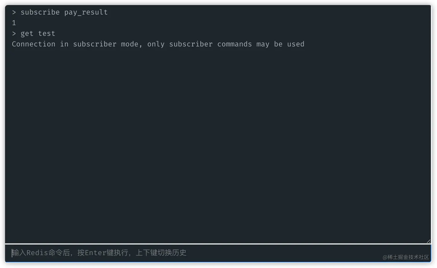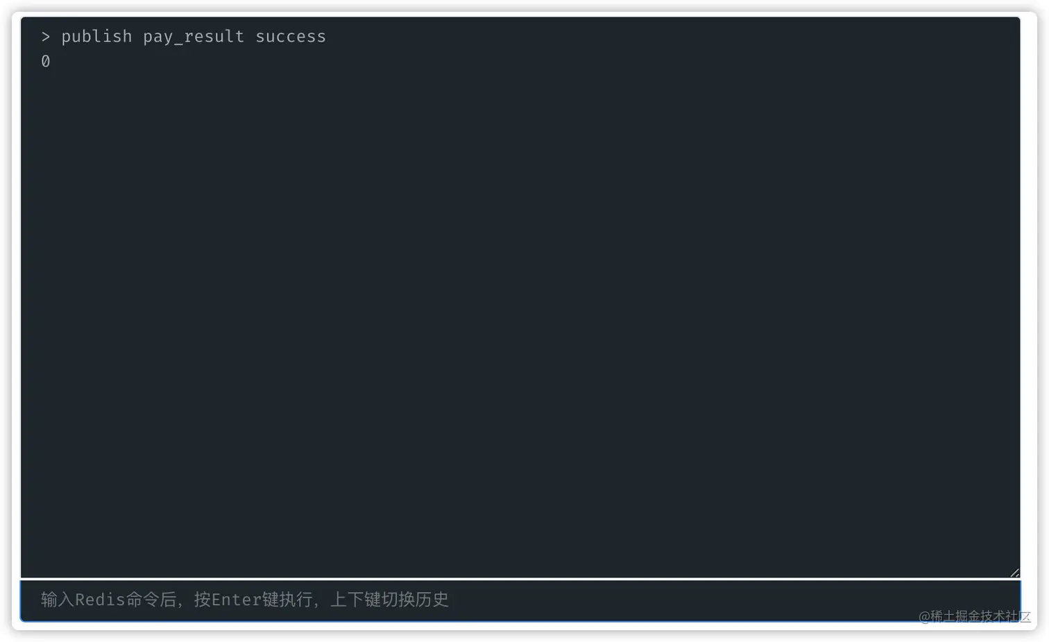 上图中,我们使用 publish 指令向 pay_result 这个频道发送了一条消息。我们可以看到 redis 向我们返回 0 ,这其实代表当前订阅者个数,由于此时没有订阅,所以返回结果为 0 。
