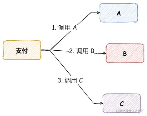 第二,如果调用业务过多,会导致下单支付接口响应时间变长。另外,如果有任一下游接口响应变慢,就会同步导致下单支付接口响应也变长。