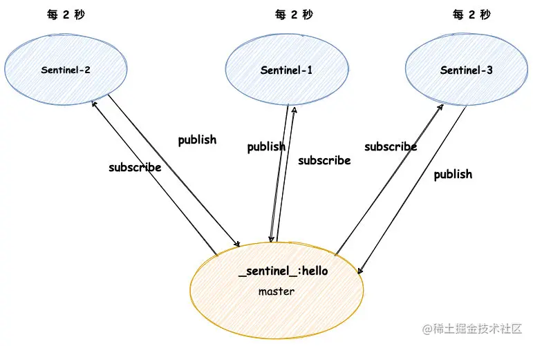 如下所示,每一个 Sentinel 节点将会定时向 _sentinel_:hello 频道发送消息,并且每个 Sentinel 都会订阅这个节点。