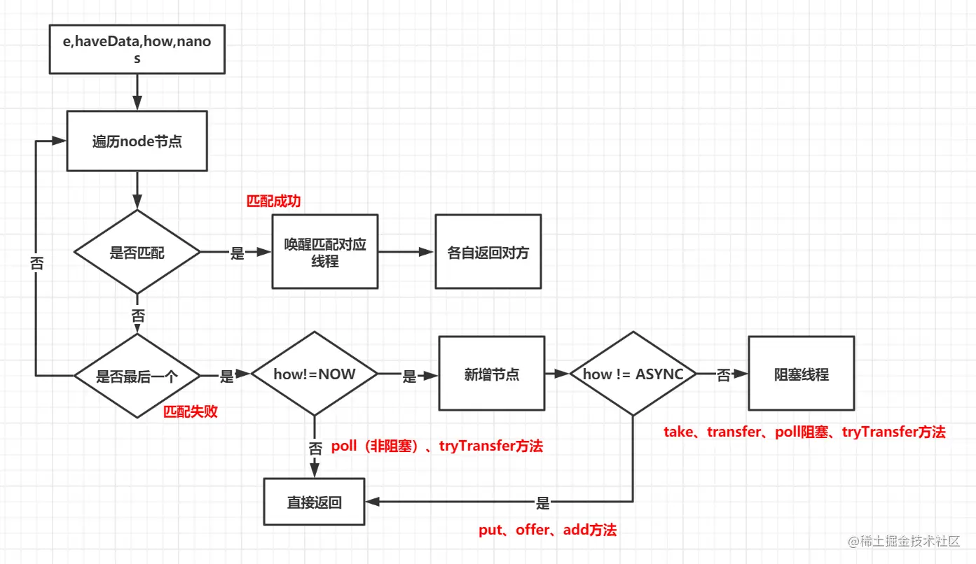 主要流程分为两步,首先是从现有链表中去匹配不相同的节点,在所有的节点遍历完成后都没有匹配上再进行后续处理,会根据传入的how参数进行判断是否阻塞线程。