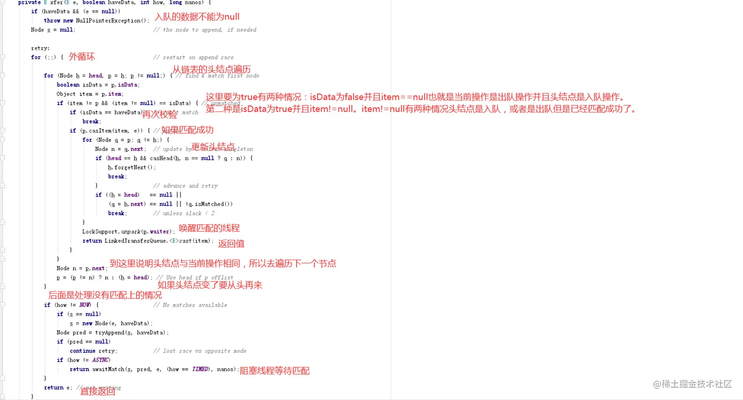 通过查看源码发现put、offer、add、take、poll方法包括tryTransfer、transfer都是调用的xfer方法,所以我们重点分析xfer方法。