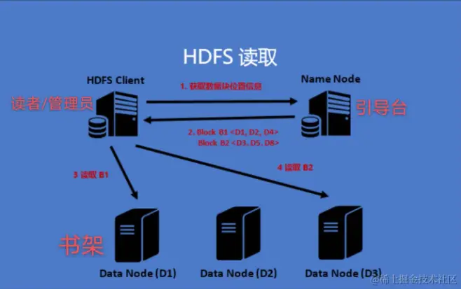 此时当我们知道书架位置后是我们直接与书架打交道,所以这里的引导台(namenode)类似于负载的作用