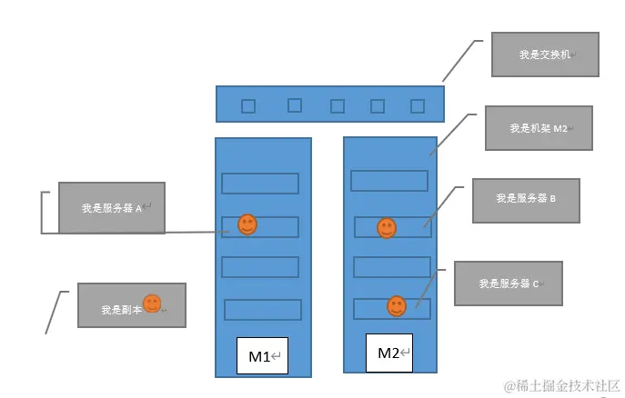 namenode根据一个hdfs放置策略,决定每个副本放到哪个datanode上,策略是:第1个副本肯定是放在跟hdfs clint所在同一个机架M1上一台服务器A,第2个副本会放到机架M2上一台服务器上B,第3个副本放到同一个机架M2的C.