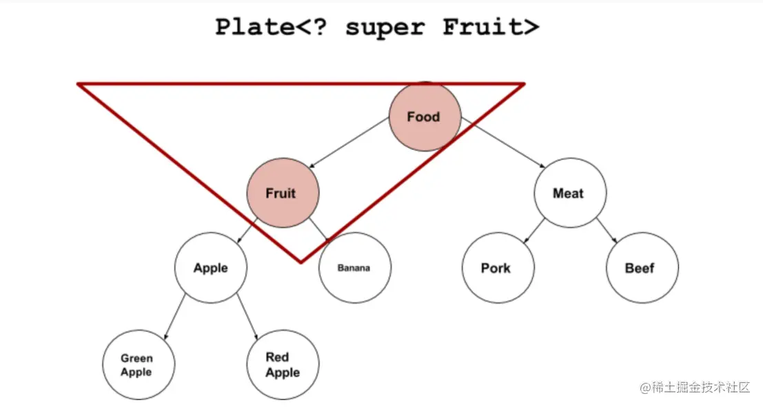 2.对应上面的例子,Plate<? super Fruit>覆盖下图中红色的区域: