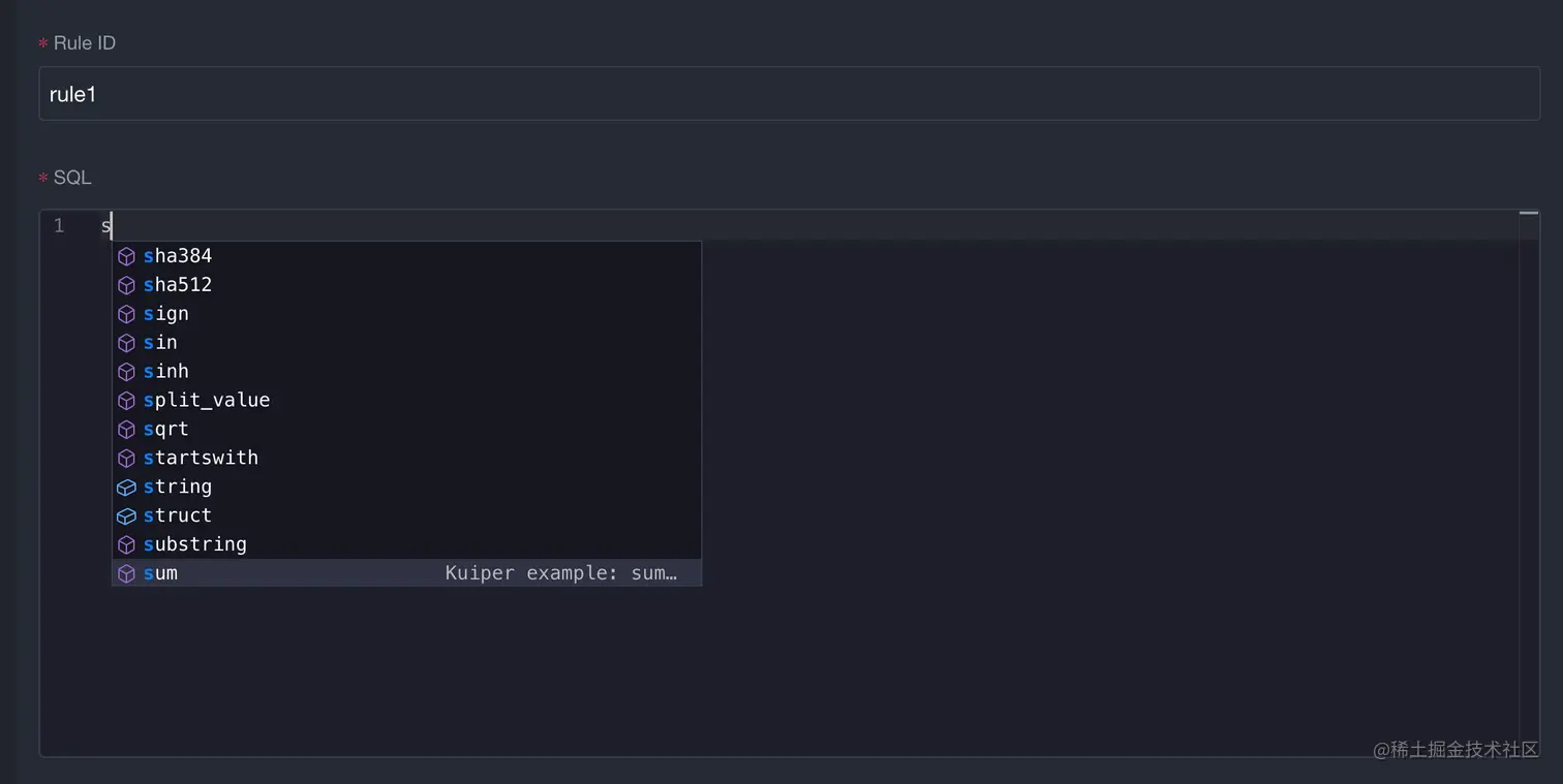上图为规则 SQL 编辑界面,系统可以在用户写 SQL 的时候给出提示。