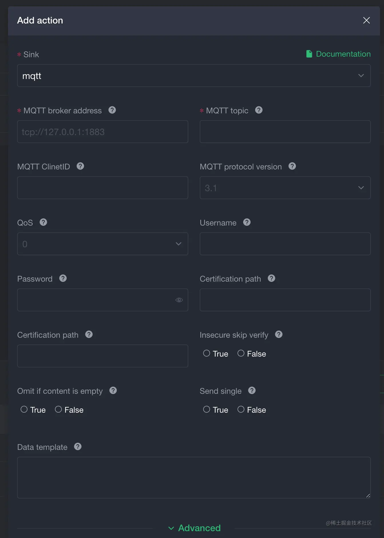 上图为设置 MQTT sink 属性的界面,在界面上通过输入和选择相应的属性就可以实现设置