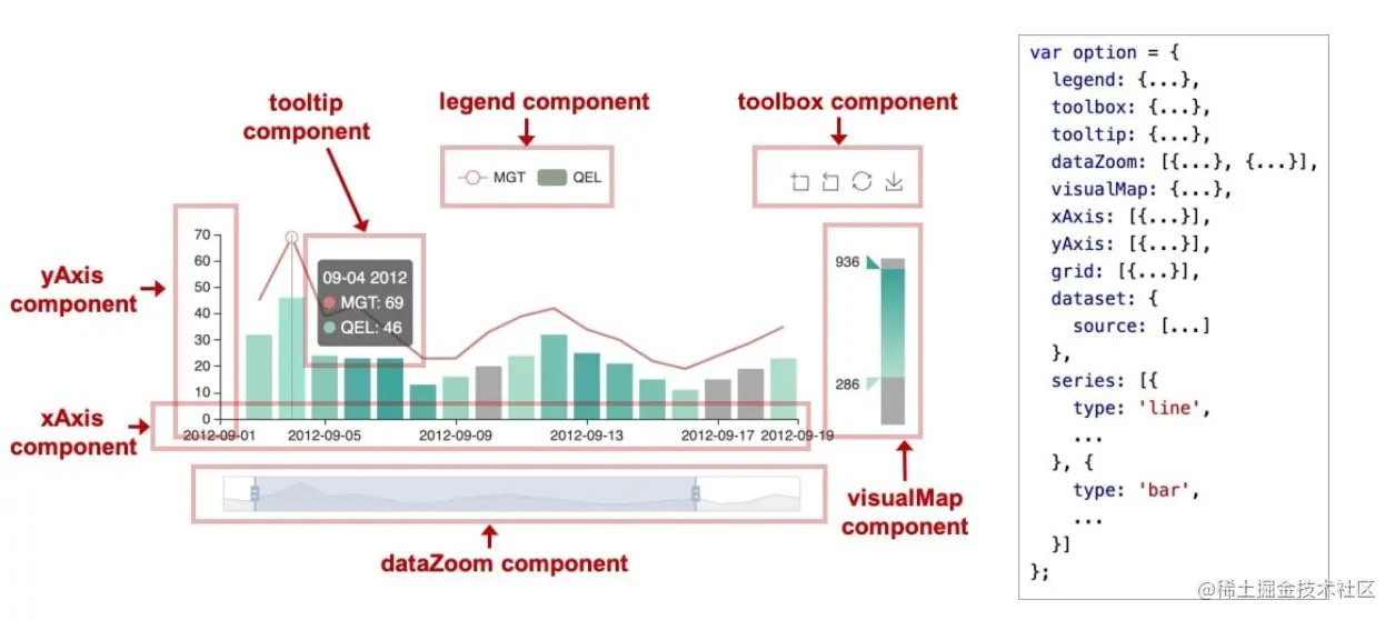 - 3.component(组件):在系列之上,echarts 中各种内容,被抽象为“组件”。例如,echarts 中至少有这些组件:xAxis(直角坐标系 X 轴)、yAxis(直角坐标系 Y 轴)、grid(直角坐标系底板)、angleAxis(极坐标系角度轴)、radiusAxis(极坐标系半径轴)、polar(极坐标系底板)、geo(地理坐标系)、dataZoom(数据区缩放组件)、visualMap(视觉映射组件)、tooltip(提示框组件)、toolbox(工具栏组件)、series(系列)、...