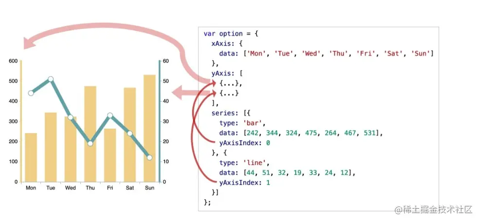 (2)再来看下图,两个 yAxis,共享了一个 xAxis。两个 series,也共享了这个 xAxis,但是分别使用不同的 yAxis,使用 yAxisIndex 来指定它自己使用的是哪个 yAxis: