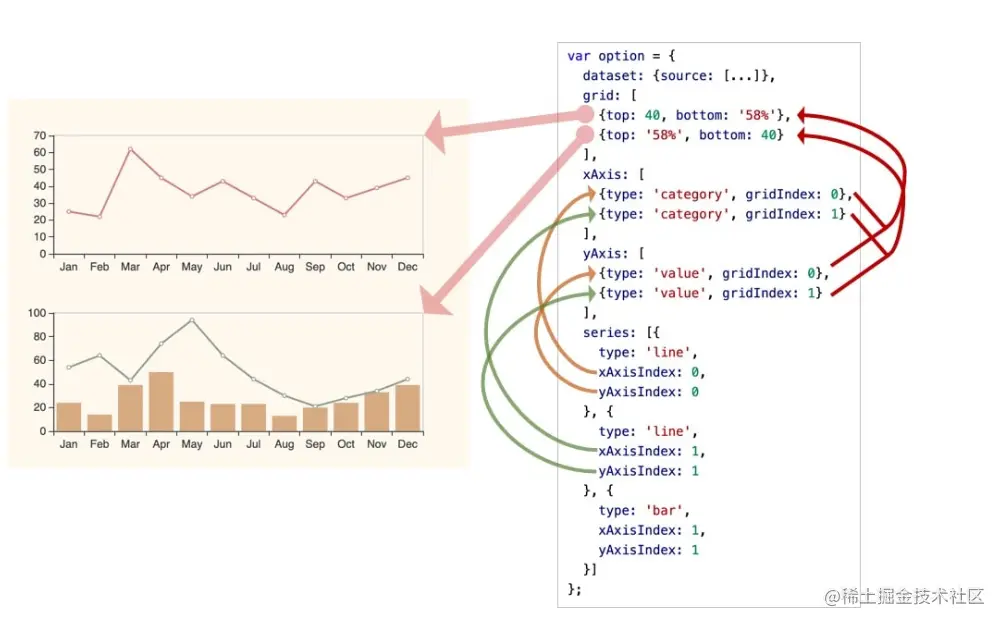 (3)再来看下图,一个 echarts 实例中,有多个 grid,每个 grid 分别有 xAxis、yAxis,他们使用 xAxisIndex、yAxisIndex、gridIndex 来指定引用关系: