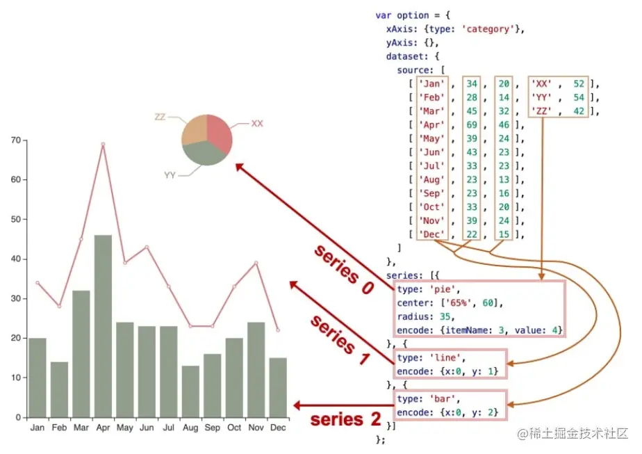 // 数据从 dataset 中取,encode 中的数值是 dataset.source 的维度 index (即第几列)