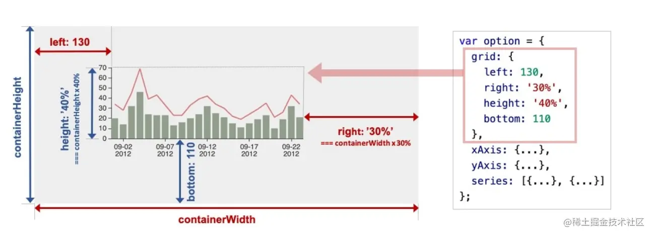 - (1)类css的绝对定位:多数组件和系列,都能够基于 top / right / down / left / width / height 绝对定位。 这种绝对定位的方式,类似于 CSS 的绝对定位(position: absolute)。绝对定位基于的是 echarts 容器 DOM 节点。