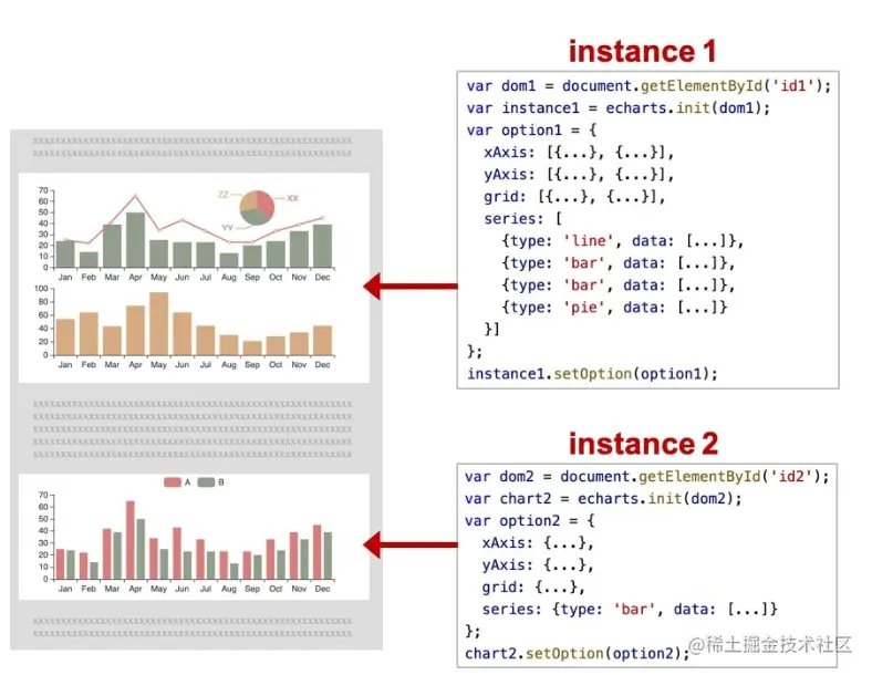 - 1.eaharts实例:一个网页中可以创建多个echarts实例。每个echarts实例中可以创建多个图表和坐标系等等,就是上述代码中的option。准备好一个DOM节点,作为echarts的渲染容器,就可以在上面创建一个echarts实例,每个echarts实例独占一个DOM节点。