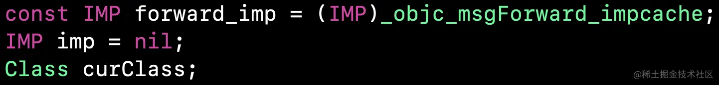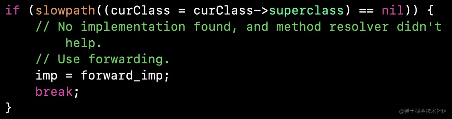 if (slowpath((curClass = curClass->superclass) == nil))再次找父类,知道找到nil,也就是NSObject的父类,此时进入判断,让imp等于forward_imp,而forward_imp等于_objc_msgForward_impcache,跳出循环。