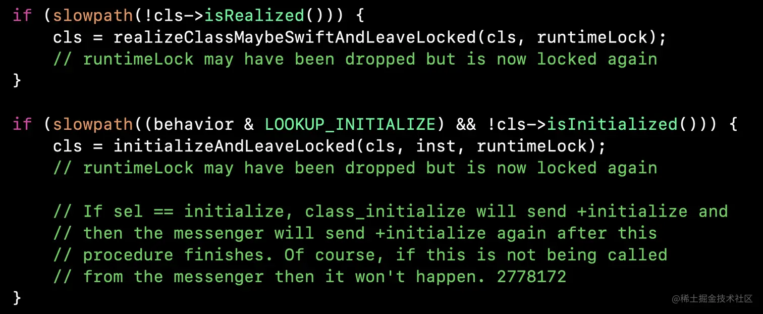 cls->superclass = supercls;告诉编译期cls的父类是supercls,addSubclass(supercls, cls);告诉编译期这个supercls类的子类是cls。所以这里面在进行isRealized时,将这个接受者父类一一找出,并进行了双向绑定。 - 下面的方法是isInitialized是否实现,如果没有实现,去实现。