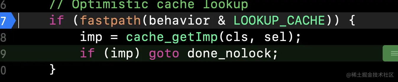 if (slowpath((curClass = curClass->superclass) == nil)) {这个判断就是将curClass指向之前curClass,所以此时的curClass就是父类) 我们进入cache_getImp看下实现,在汇编中看到如下代码