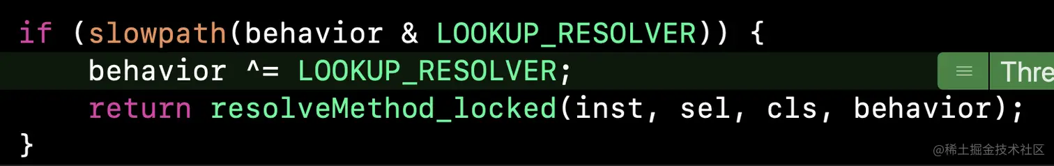 if (!lookUpImpOrNil(cls, resolve_sel, cls->ISA())) {这个判断是再去调用lookUpImpOrForward,这次传入的方法是resolveInstanceMethod:,cls还是接收者不变。