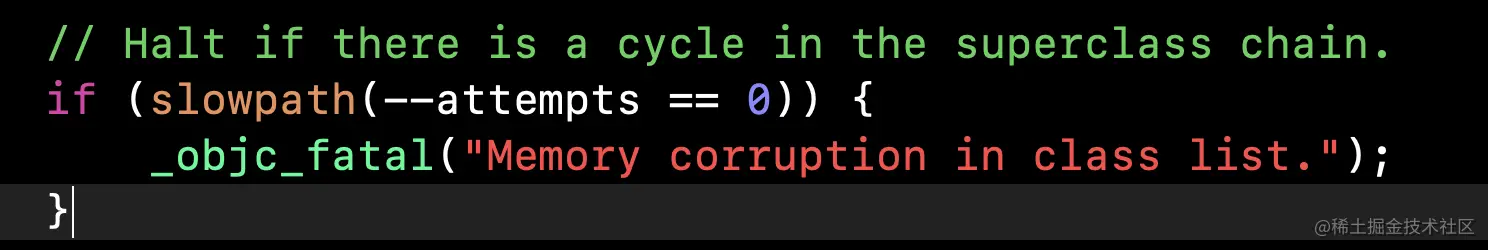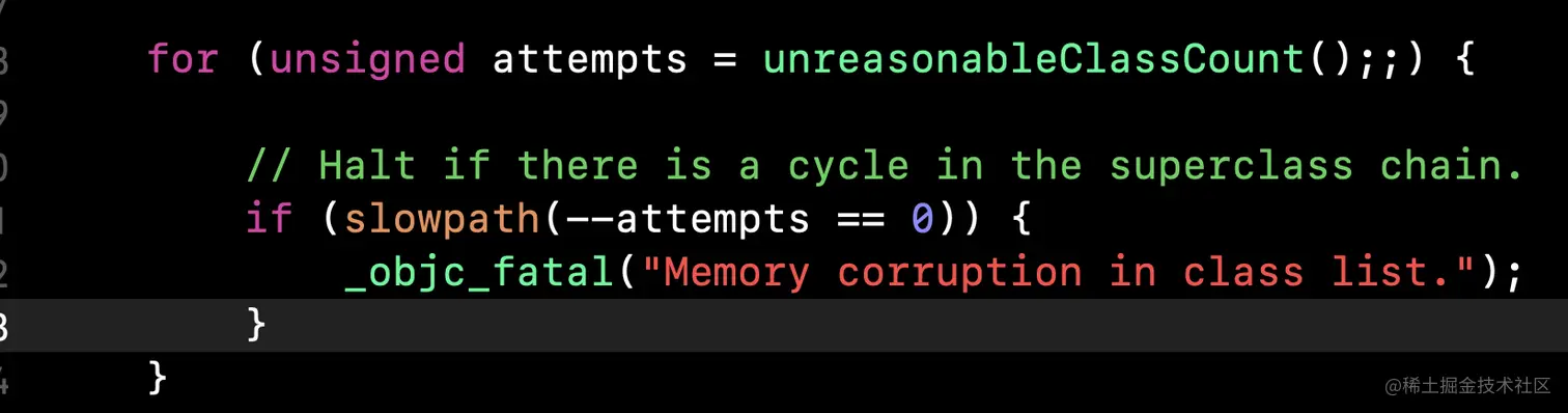 翻译意思:当attempts做--操作等于0时,就进入,提示报错。如果超类链中存在循环,则暂停。