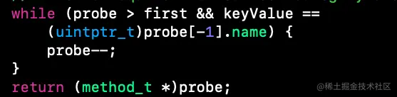 - if (keyValue == probeValue) {意思就是如果取出来的方法名跟传进来的key(方法名sel)一样,进入。这里实不相等的,所以跳下去,我们解释下进入的方法