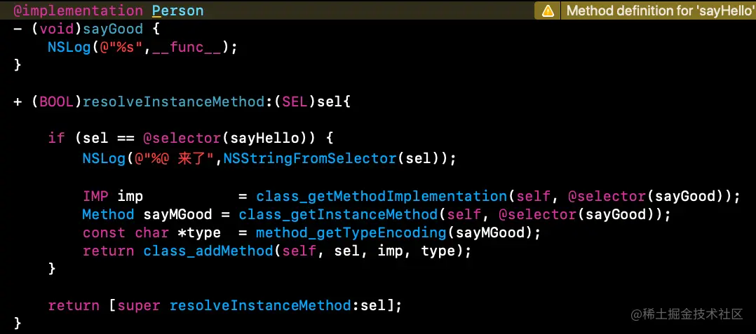 提示该方法未找到。我们上面分析了,系统找不到方法会给一次机会resolveInstanceMethod:,也就是只要实现就可以,下面我们验证下。