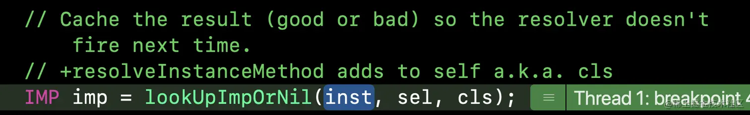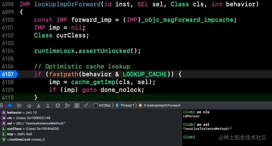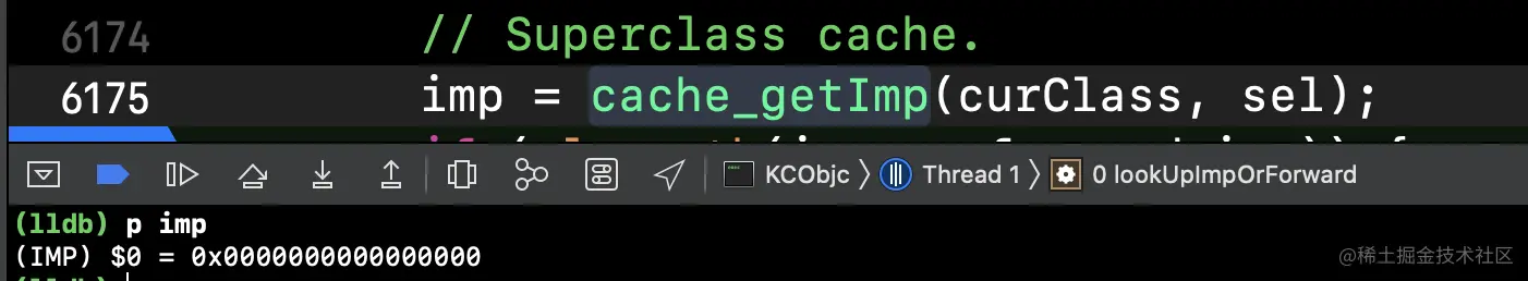 发现sel还是之前的方法,但是对应的imp变为_objc_msgForward_impcache,也就是返回的imp为_objc_msgForward_impcache。(推断当imp返回nil的时候,方法会再次调用lookUpImpOrForward,此时的取出的imp为_objc_msgForward_impcache并返回)后续验证