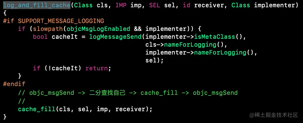 它会调用cache_fill,而cache_fill是会调用cache->insert,将方法resolveInstanceMethod写入cache_t,然后刷新cache_t。(这个分析,我后面再去验证下,lookUpImpOrForward方法循环很多次,有6次之多,具体还要理清,消息转发这部分很重要)
