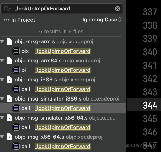 我们发现并没有搜到想要的结果,此时说明汇编中没有该方法实现,此时搜lookUpImpOrForward看下