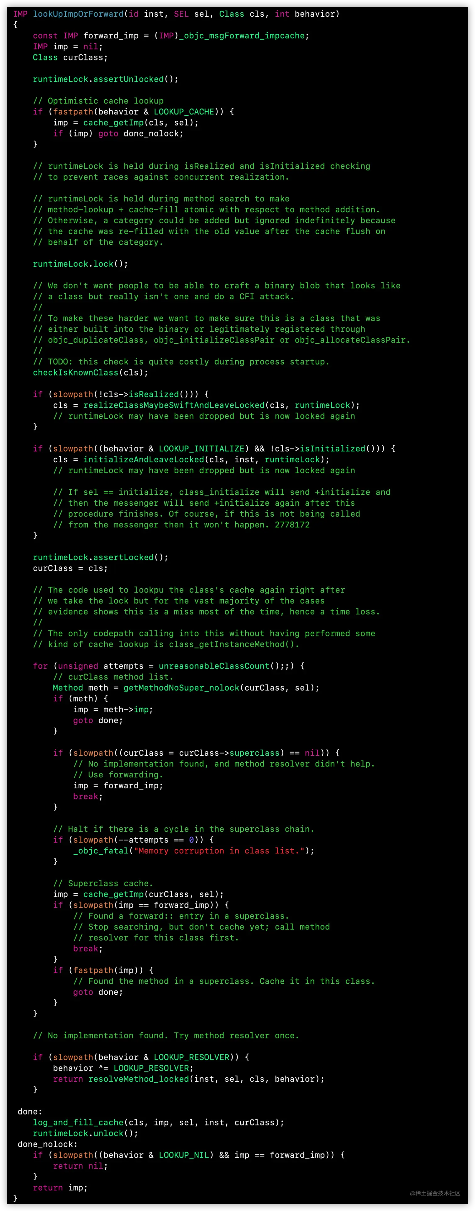 runtimeLock在方法搜索过程中保持,使方法查找+缓存填充保持原子性相对于方法添加。否则,可以添加一个类别,但是会无限期地忽略它,因为代表类别的缓存刷新之后,缓存会用旧值重新填充。