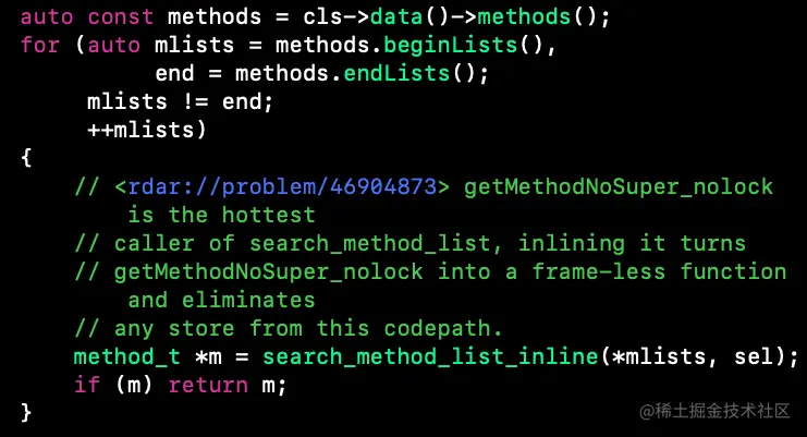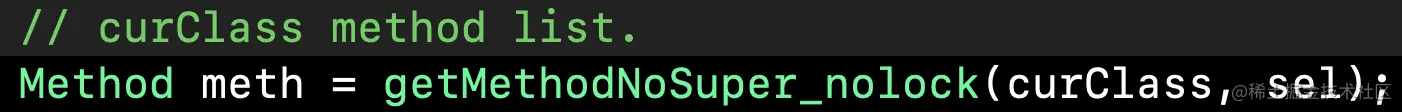上面将接受者cls赋值给curClass)的方法列表中找到sel方法,并返回。我们看下getMethodNoSuper_nolock具体实现,截图为主要方法